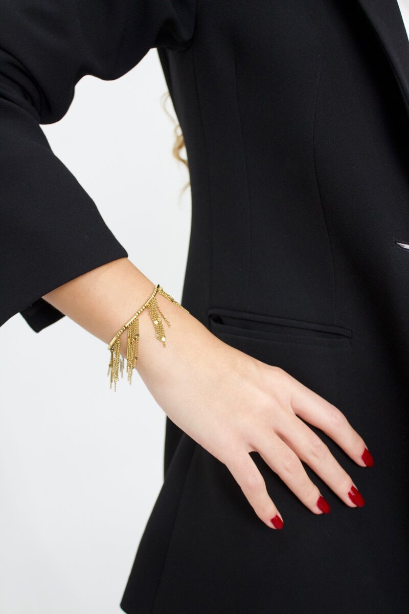Bracciale realizzato in acciaio con galvanica oro giallo ad alto spessore e resistenza con frange di catene pendenti.